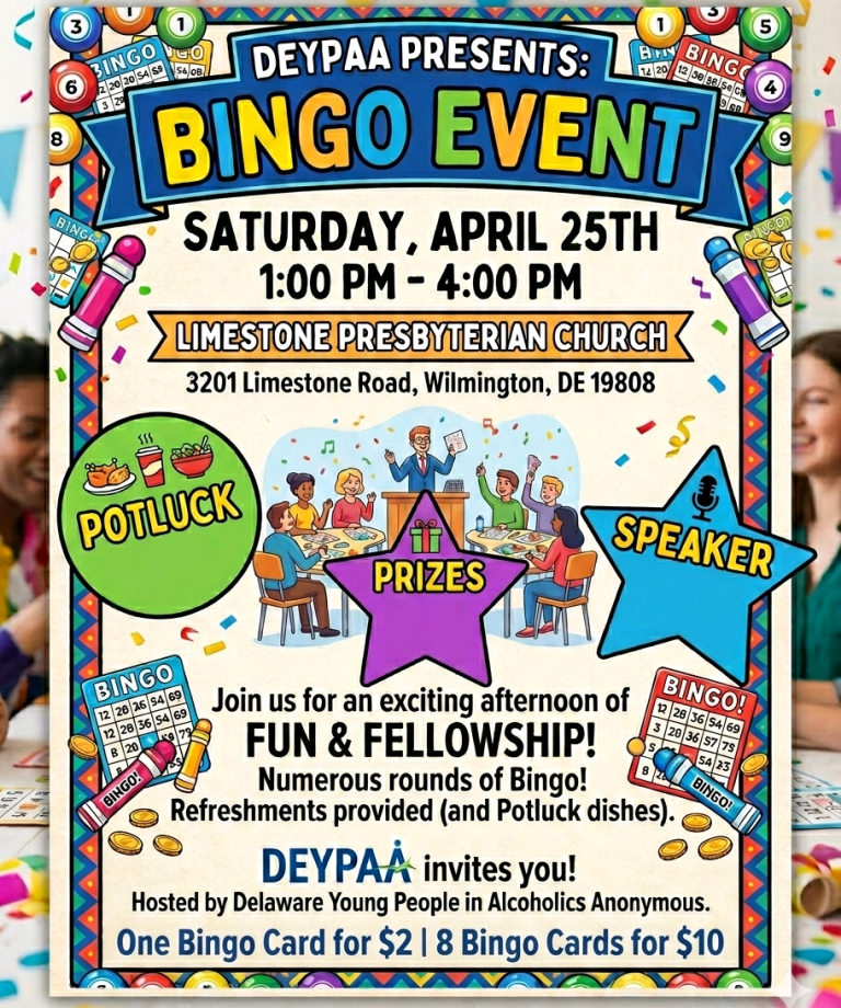 Join us from 1:00 to 4:00 PM for an afternoon of fun and fellowship hosted by Delaware Young People in Alcoholics Anonymous.